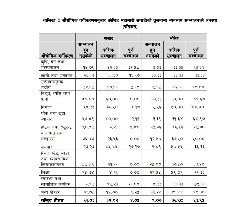 उत्पादनमूलक उद्योगहरू ४९ दशमलव शून्य ४ पूर्ण रूपमा सञ्चालित छन् भने ४२ दशमलव ३१ आंशिक सञ्चालन र ८ दशमलव ६५ प्रतिशत सञ्चालन हुन सकेका छैनन् । यस्तै, २९ दशमलव ७० प्रतिशत होटेल तथा रेस्टुराँ, ४४ दशमलव ४४ प्रतिशत निर्माण उद्योग, ५० प्रतिशत यातायात तथा भण्डारण, ३६ प्रतिशत सञ्चार, ३७ दशमलव ५० प्रतिशत रियल इस्टेट भाडा तथा व्यावसायिक क्रियाकलापहरू पूर्ण रूपमा सञ्चालनमा आएका छन् ।