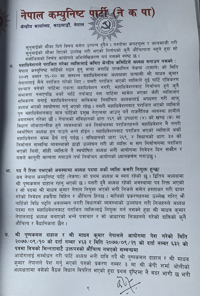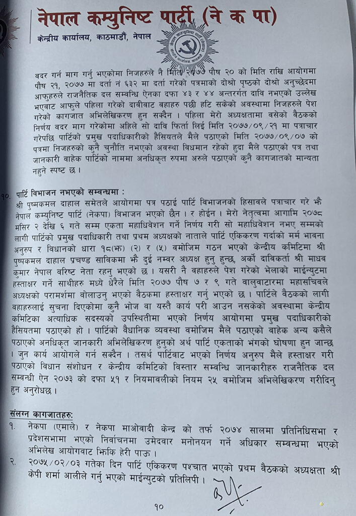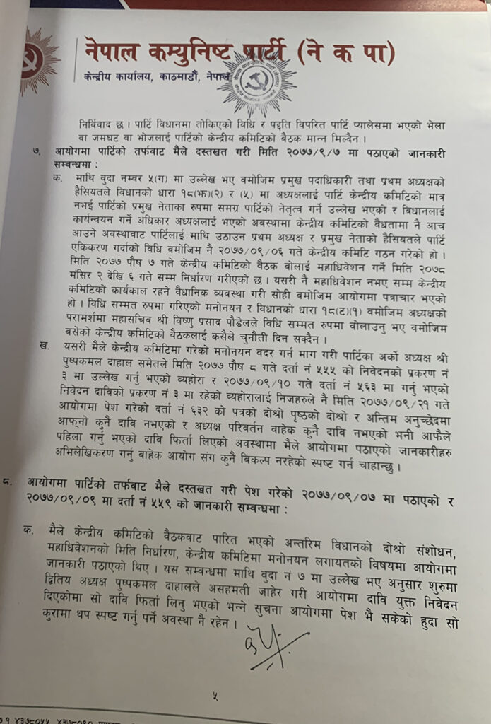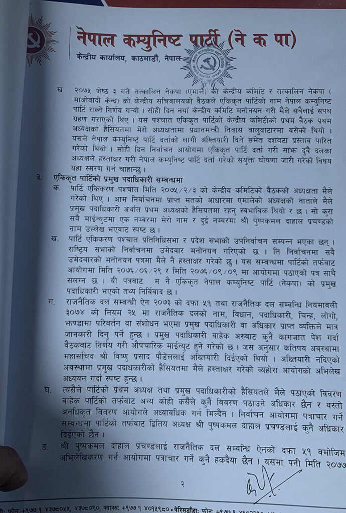 ११ पृष्ठ लामो पत्र लेख्दै ओलीले नेकपाको आफू प्रथम अध्यक्ष रहेको बताउदै त्यही प्रमुख पदाधिकारीको हैसियतमा आफूले पठाएको विवरणमात्र सूचीकरण गर्न आयोगलाई सुझाव दिएका हुन् । यसको वैधानिक अधिकार आफूमा रहेको समेत उनले दाबी गरेका छन् । नेकपाको आधिकारिक निर्णयमा हस्ताक्षर गर्ने अधिकार आफ्नो मात्र रहेको उल्लेख गर्दै उनले अन्यको हस्ताक्षर अनधिकृत भएको जिकिर गरेका छन् ।