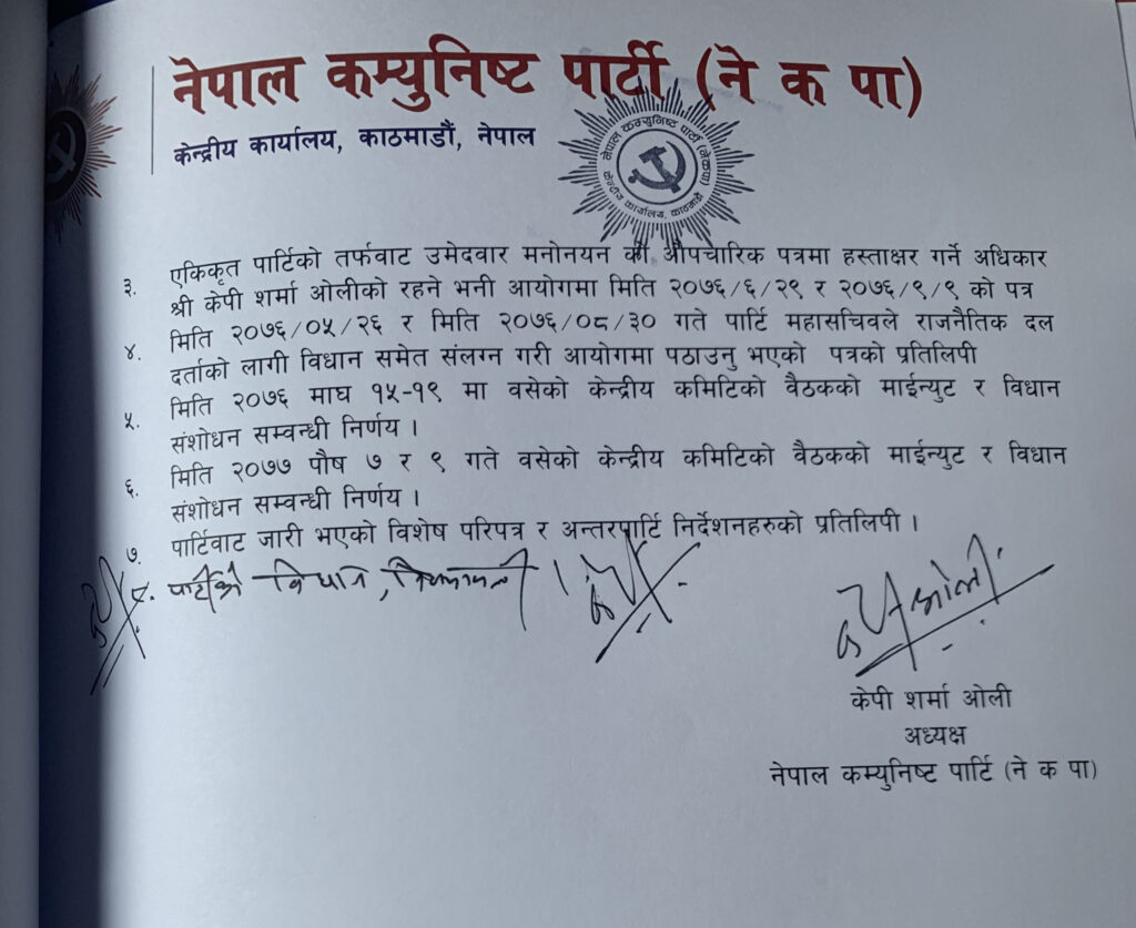 नेकपा (ओली समूह) को अध्यक्ष ओलीले निर्वाचन आयोगलाई असम्बन्धित व्यक्ति वा पार्टीबाट पठाएको निवेदन अभिलेखीकरण नगर्न पत्राचार गरेका हुन्। आयोगले पुस २३ मा पठाएको पत्रको जवाफमा नेकपा अध्यक्ष ओलीले आफूले पठाएको विवरणमात्र सूचीकरण गर्न निर्वाचन आयोगलाई सुझाव दिएका छन् ।