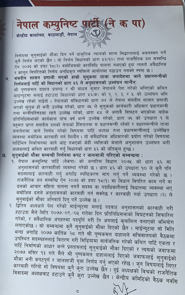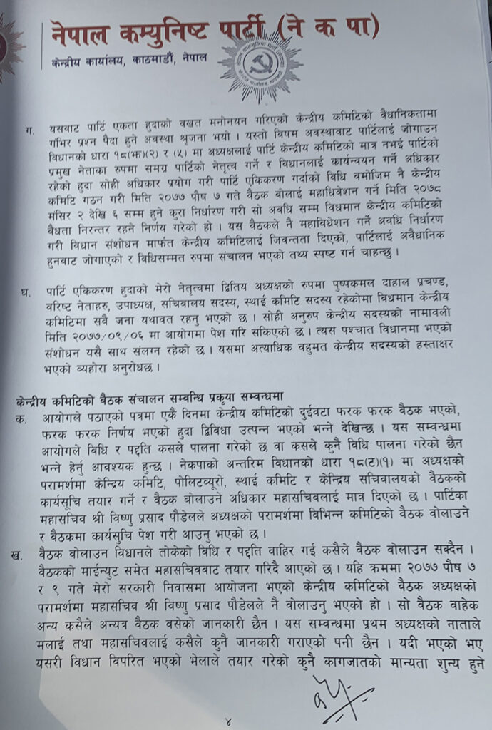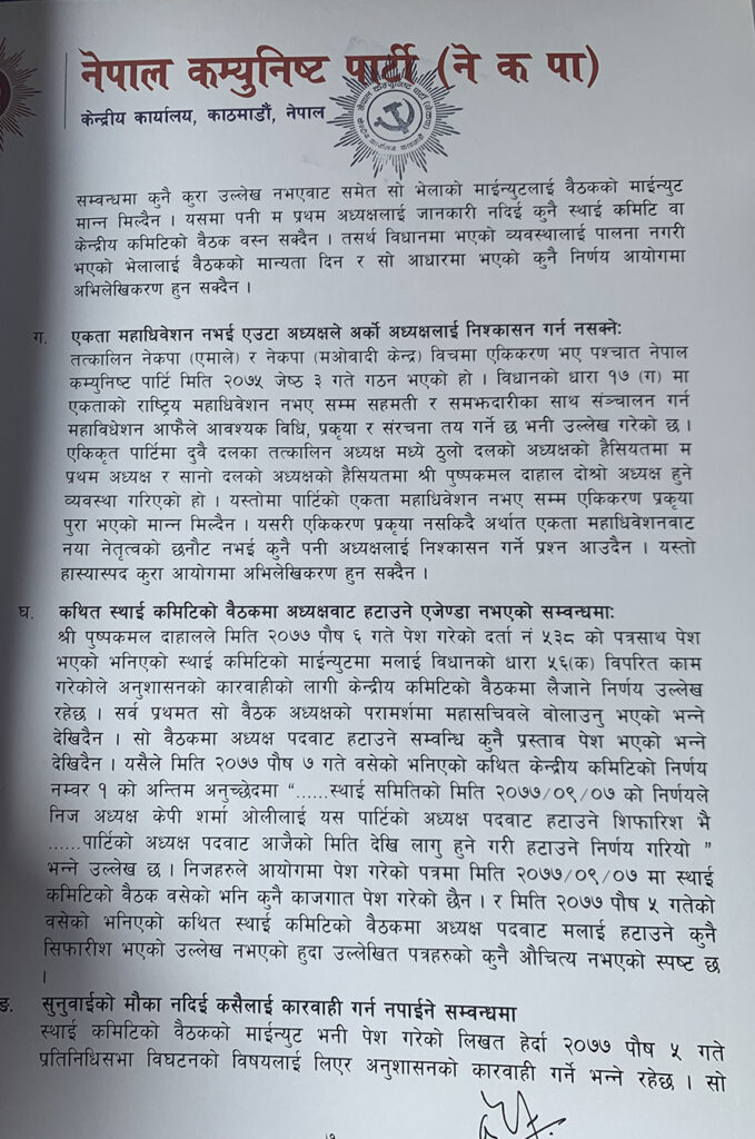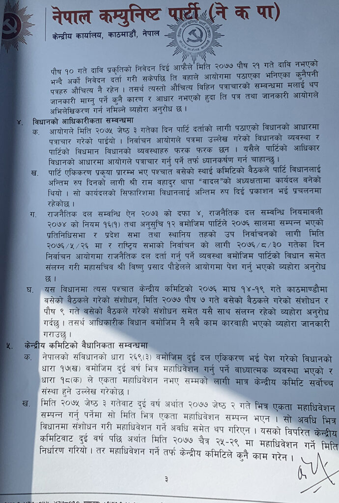 ओलीले आफू नेतृत्व पार्टीले कुनै गैरसंवैधानिक काम नगरेको जिकिर समेत गरेका छन् । ‘मैले पार्टी प्रमुखको हैसियतमा गरेको कार्य र पार्टीबाट भएका निर्णयहरू कानुनसम्मत् विधानको व्यवस्था अनुरुप तथा नेपालको संविधान अनुरुप भएको हुँदा राजनीतिक दलसम्बन्धी ऐन २०७३ को दफ ५१ तथा राजनीतिक दलसम्बन्धी नियमावली २०७४ को नियम २५ बमोजिम अभिलेखीकरण गरिदिनु हुन अनुरोध छ,’ ओलीले पत्रमा उल्लेख गरेका छन् ।