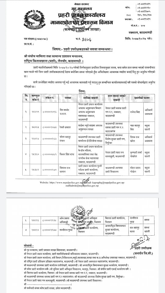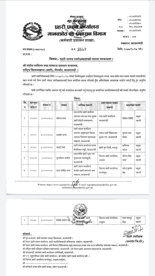 यस्तै प्रहरी प्रधान कार्यालयले ६ जना प्रहरी नायब उपरीक्षक डिएसपी हरुको सरुवा गर्नुका साथै हालै बढुवा भएका १६ जना एसपीको पदस्थापन गरेको छ । हालै बढुवा भएर खाली भएको नागर प्रहरी कार्यालयमा कोमल शाह आएका छन् भने नेपाल प्रहरी सिंहदरबार सुरक्षा गणमा रामहरि पाण्डेको सरुवा भएको छ ।