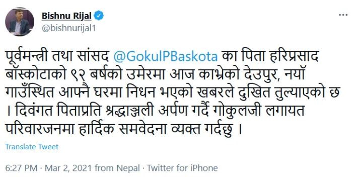 बाँस्कोटाका पिता हरिप्रसाद बाँस्कोटाको आज ९२ वर्षको उमेरमा निधन भएको हो ।