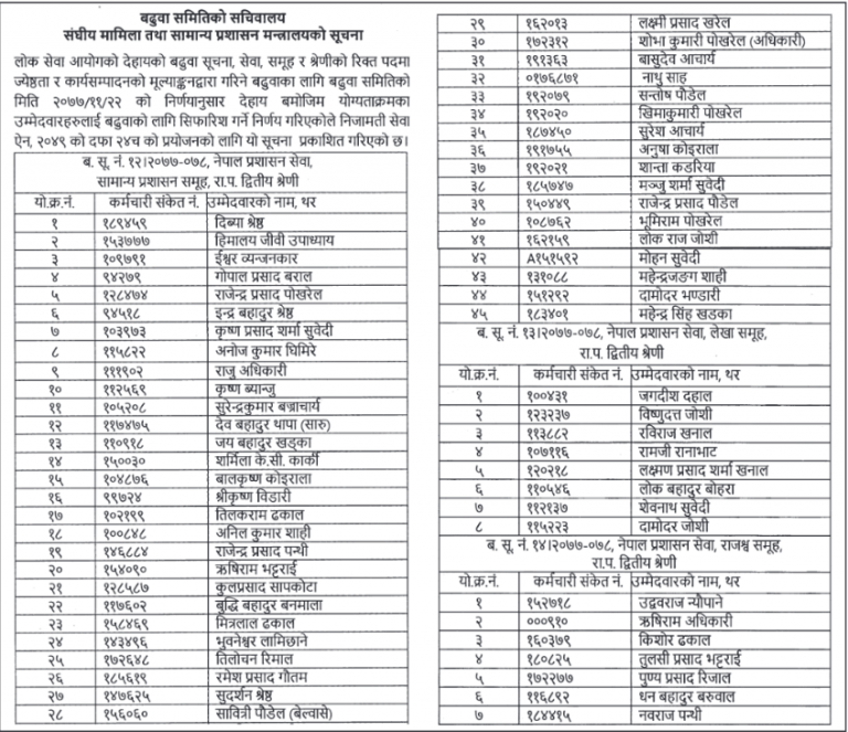 संघीय मामिला तथा सामान्य प्रशासन मन्त्रालयले विभिन्न सेवा समूहका गरी ६० कर्मचारीको बढूवा सूची सार्वजनिक गरेको छ । बढूवा सिफारिस समितिको गत २२ गतेको निर्णय अनुसार नेपाल प्रशासन सेवा,सामान्य प्रशासन समूह,नेपाल प्रशासन सेवा,लेखा समूह र नेपाल प्रशासन सेवा,राजश्व समूहका ६० कर्मचारीहरुको बढूवा सिफारिस सूची प्रकाशन गरेको हो । सूची अनुसार प्रशासन सेवाका ४५,लेखा समूहबाट ८ र राजश्व समूहका ७ जना गरी राप द्धितीय श्रेणीमा बढुवा सिफारिस गरिएको हो । जेष्ठता र कासमुको आधरमा यी कर्मचारीहरुको बढुृवा सिफारिस गरिएको हो समितिले जनाएको छ ।